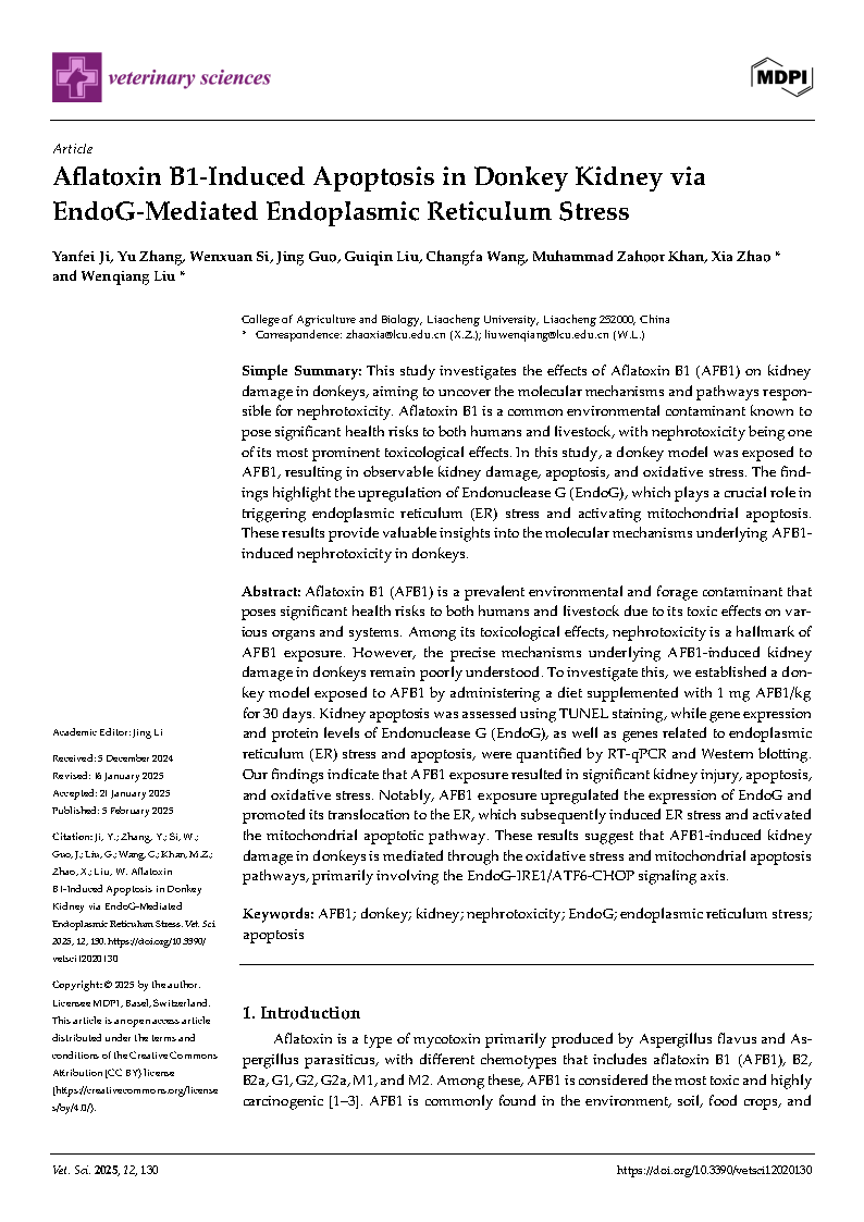 电影网站 2022级动物学专业研究生纪言霏在《Veternary Science》杂志上发表了题为“Aflatoxin B1-Induced Apoptosis in Donkey Kidney via EndoG-Mediated Endoplasmic Reticulum Stress”的研究论文,指导教师为刘文强教授、赵霞博士。