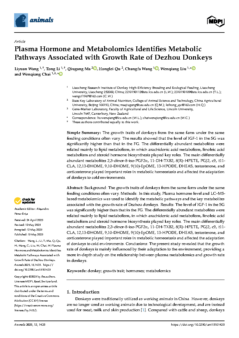 电影网站 2022级动物学专业研究生王莉源在《Animals》杂志上发表了题为“Plasma Hormone and Metabolomics Identifies Metabolic Pathways Associated with Growth Rate of Dezhou Donkeys”的研究论文,指导教师为刘文强教授、柴文琼副教授。