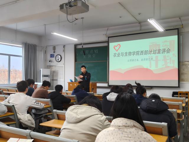 为积极响应国家号召,鼓励和引导优秀大学生投身西部建设,帮助莘莘学子打开一扇通往西部、通往梦想的窗口,3月6日,农业与生物学院于2号教学楼501教室举办“青春逐梦西部,书写别样人生”活动,团委副书记任庆超担任主讲人。