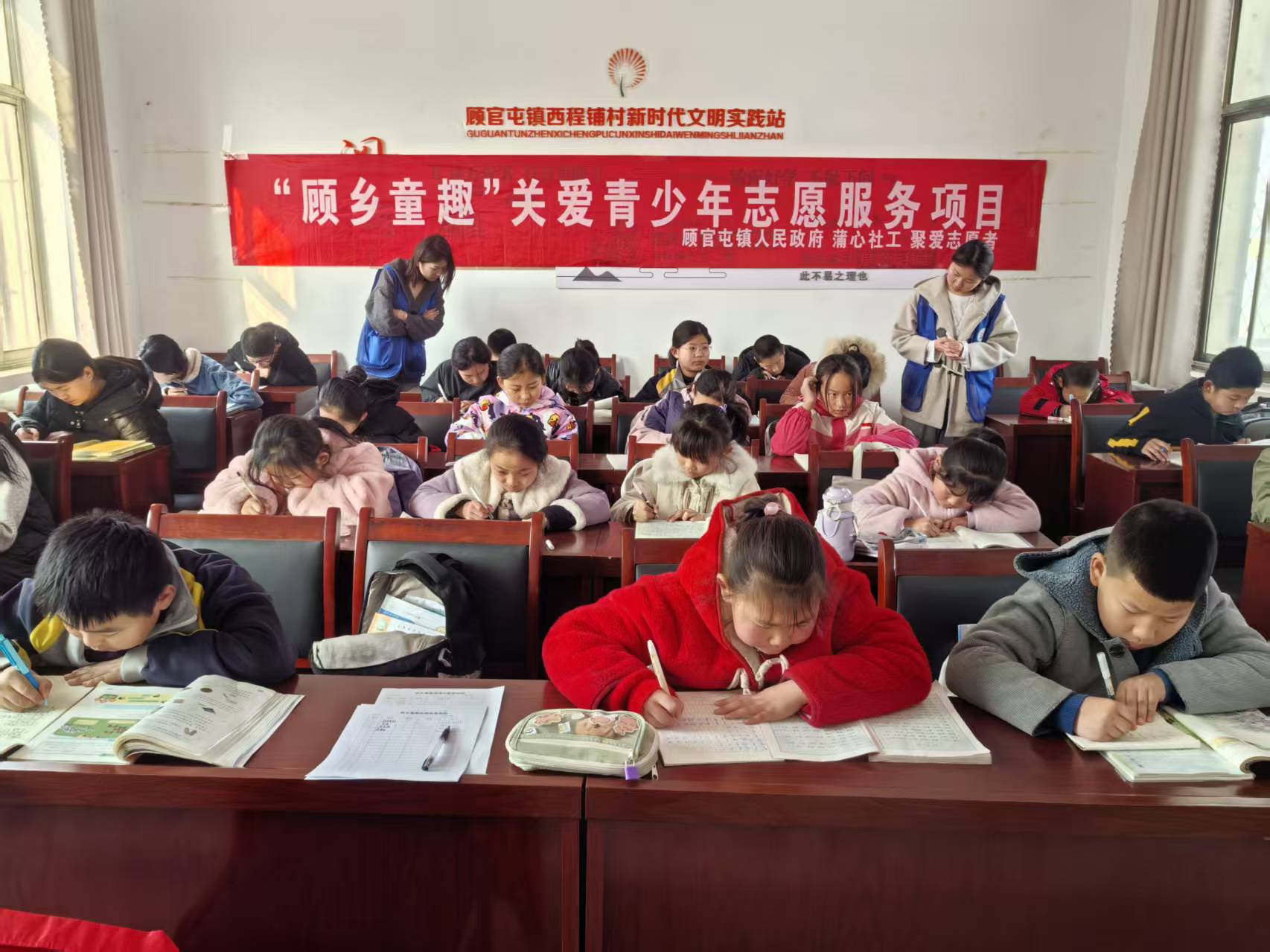 活动伊始,志愿者们围坐在孩子们身边,细心地解答孩子们在学习过程中遇到的各种难题。无论是数学作业中的复杂方程式,还是语文课文中的生僻字词,她们都态度温和、循循善诱,手把手地带领孩子们熟悉运算步骤、纠正书写笔画,帮助他们解决一个又一个学习上的“小麻烦”。志愿者们的到来,就像一场温润的甘霖,滋润着孩子们对知识的渴望之心。一位学生开心地说:“志愿老师们讲得特别清楚,以前我觉得数学好难,现在感觉也没那么可怕了。”
