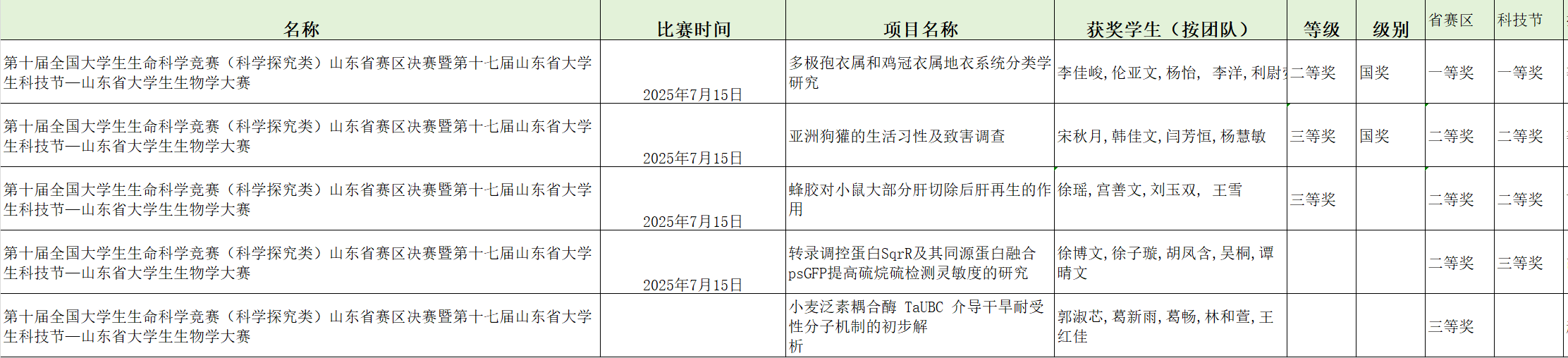 本次大赛由山东省科学技术协会、山东省教育厅等单位联合主办,吸引了全省数十所高校的数百支队伍参赛。 电影网站 5支参赛团队在此次赛事中表现出色,凭借扎实的专业知识、创新的研究思路和严谨的科学态度,斩获佳绩,为学院和学校赢得了显著荣誉。 电影网站 被推荐获全国大学生生命科学竞赛(2025,科学探究类)国家级奖项二等奖1项、三等奖2项,获省级奖项一等奖1项、二等奖3项、三等奖1项,并获得山东省大学生生物学大赛一等奖1项、二等奖2项、三等奖1项。