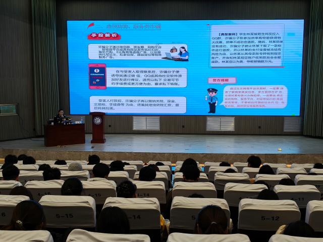活动伊始,李坤民警以人身、交通、财产、网络四大安全领域为切入点,聚焦高校诈骗高发态势,系统拆解刷单返利、网络贷款、冒充客服、游戏账号交易等十大典型骗局。她结合曹某刷单被骗42万元、王某游戏账号交易遭诈等真实案例,深入剖析“小额利诱套牢”“虚假平台伪装”等诈骗套路,点明“高收益低风险”“紧急转账汇款”等高频诈骗话术,帮助学生精准识别诈骗陷阱。同时,她传授“不轻信、不透露、不点击、多核实”的反诈四字准则,详解《反电信网络诈骗法》核心条款,并明确受骗后证据留存、拨打110报警电话及96110反诈专线等止损补救措施,为学生构建起全方位的反诈知识防护体系。