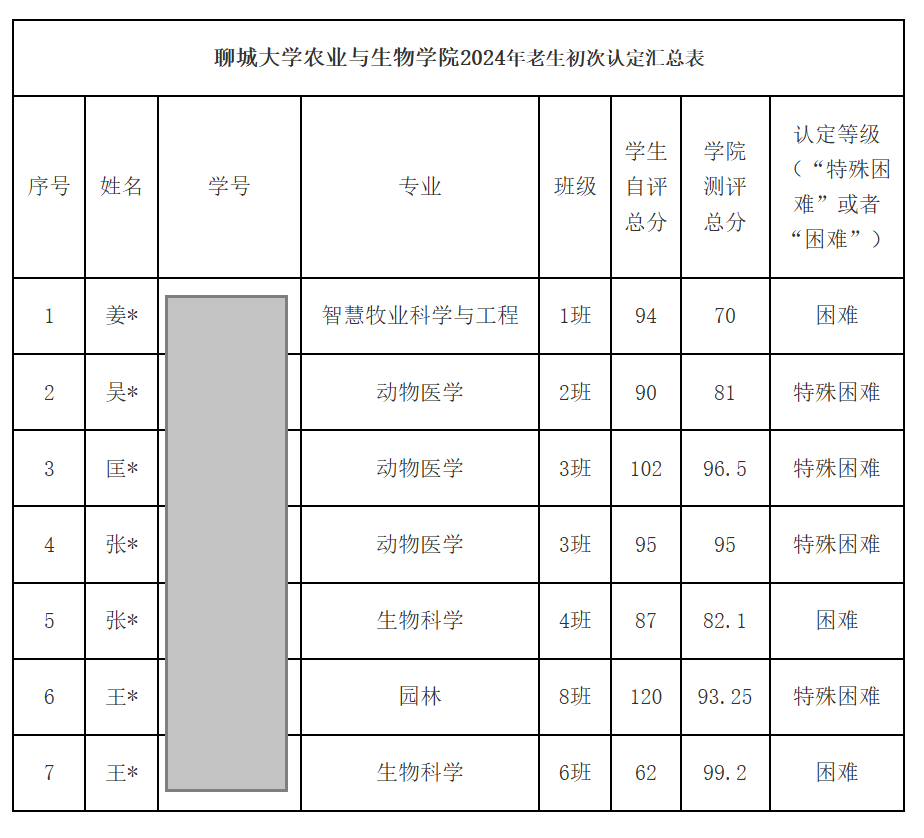 (二)认定过程:本次认定工作遵循“坚持实事求是、客观公平,坚持定量评价与定性评价相结合,坚持公开透明与保护隐私相结合,坚持积极引导与自愿申请相结合”的原则,在文件指导下开展相关工作。经过学生本人申请与递交申请材料,家庭经济困难学生认定评议小组审查学生提交的相关证明材料,并根据学生提交材料,认真审核申请学生的家庭经济状况、提供的证明材料是否真实、合法、有效,是否符合申请条件等,积极听取学生意见,了解申请学生的日常消费表现及在校内外已接受资助的情况等,进一步了解学生日常,充分调查了解情况与学生自测结果,本着客观、公正的原则和对学生负责的态度,对提出认定申请的同学进行讨论,同时开展民意测验。经上述环节,各班级初步确定班级内家庭经济困难学生认定推荐名单及档次。经学院进一步审查申请理由、证明材料等,确定2024年农业与生物学院家庭经济困难学生认定名单及档次。