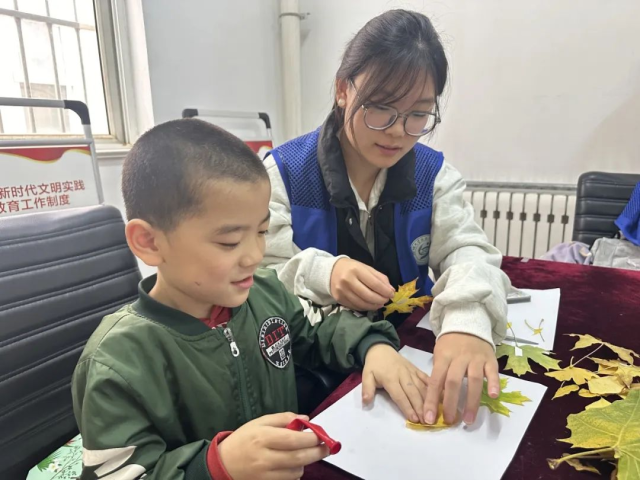 讲解结束之后,志愿者们拿出提前准备好的各种落叶以及剪刀、胶水等其它工具,与小朋友们一起发挥想象,制作落叶画。制作期间,一片片原本平平无奇的落叶在志愿者和小朋友的手中相互拼接、粘连,被赋予了不同的意义。